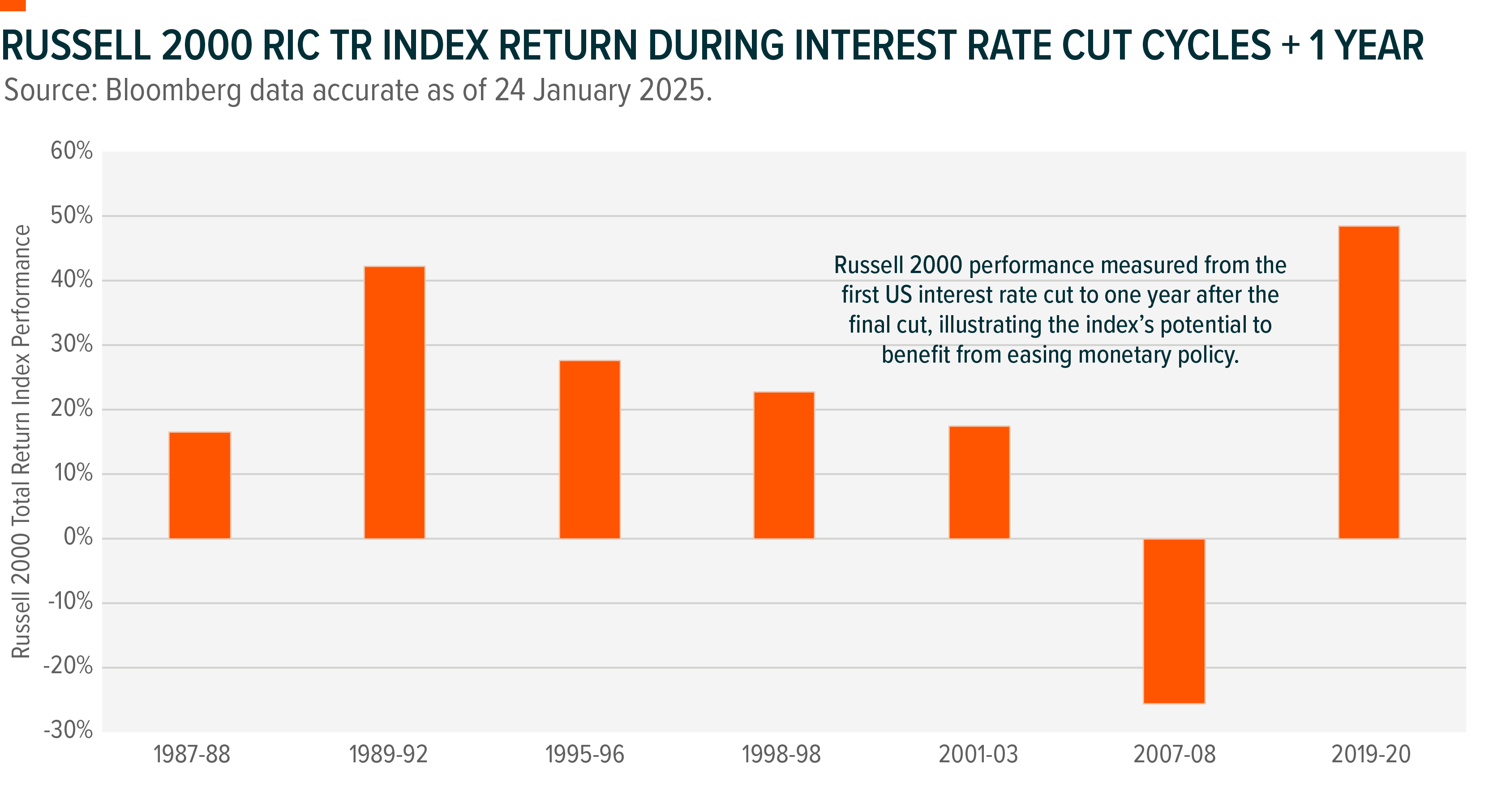 In addition, small caps often benefit from changes in monetary policy. During periods of monetary easing, lower interest rates reduce borrowing costs, potentially creating opportunities for reinvestment and innovation. This sensitivity to interest rate changes further enhances their appeal as a growth-oriented allocation in diverse market conditions.