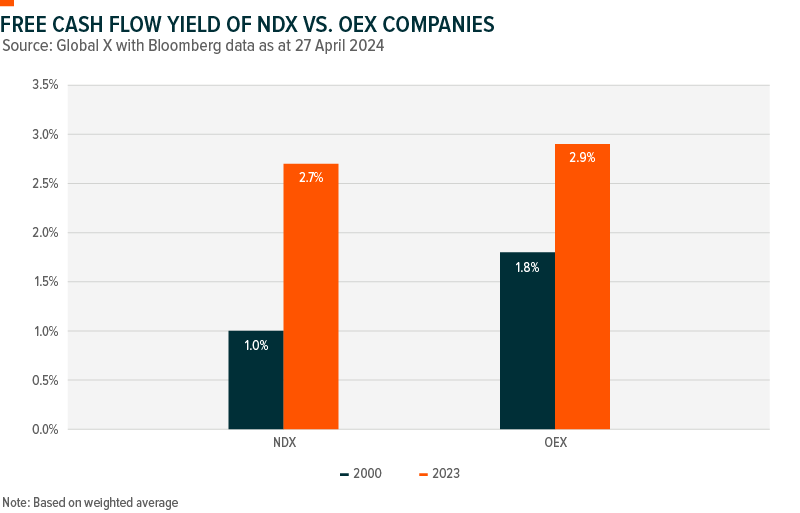Looking at Jeff Bezos’ favourite number, free cash flow yield, which measures how much cash tech companies are generating relative to their market value, the Nasdaq 100 free cash flow yield climbed from 1.0% to 2.7% over the same period. This indicates improved profitability, yes, but also potentially improved value as well. If we compare this to the S&P 100 Index (OEX), which comprises the top 100 companies in the S&P and measures the broader market, 91% of companies were profitable in 2023, with a free cash flow (FCF) yield of 2.9%. This indicates the tech sector is converging on the broad market.